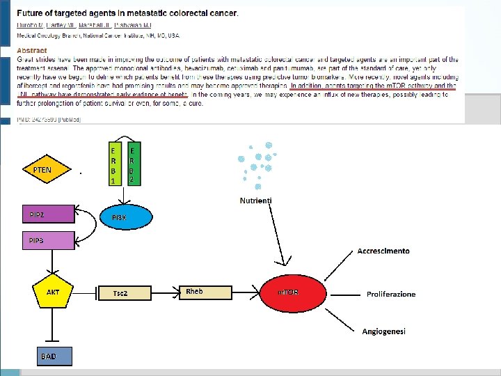 Inibitori EGFR ● ● Anticorpi monoclonali : Cetuximab, Panitumumab Agiscono sul dominio extracellulare dell'EGFR comportandosi da inibitori esterni, competono con il ligando naturale Inibitori delle Tirosin-chinasi (TKIs): Gefitinib, Erlotinib Agiscono sul dominio intracellulare dell'EGFR bloccando l'attività tironsin-chinasica delle cellule, viene bloccata tutta la via di trasduzione del segnale