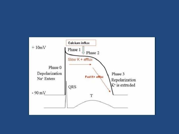 Phase 1 • Phase 1 of the myocyte action potential occurs with the inactivation of the fast Na+ channels • The transient net outward current causing the small downward deflection of the action potential is due to the movement of K+ and Cl ions, carried by the Ito 1 and Ito 2 currents respectively