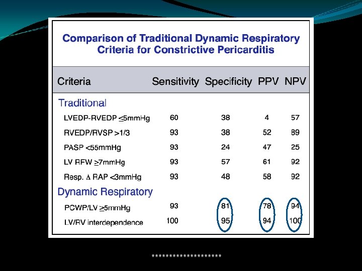 Constrictive Pericarditis in the Modern Era: Novel Criteria for Diagnosis in the Cardiac Catheterization Laboratory J Am Coll Cardiol. 2008; 51(3). Deepak R. Talreja, ; Rick A. Nishimura, ; Jae K. Oh, ; David R. Holmes Criterion Sensitivity (%) Specificity (%) Positive Predictive Accuracy (%) Negative Predictive Accuracy (%) LVEDP − RVEDP ≤ 5 mm Hg 46 54 58 40 PASP <55 mm Hg 90 29 73 66 RVEDP/RVSP >1/3 93 46 71 79 LV RFW >7 mm Hg 45 44 62 42 71 37 62 39 97 100 95 Inspiratory decrease in RAP <5 mm Hg Systolic area index >1. 1