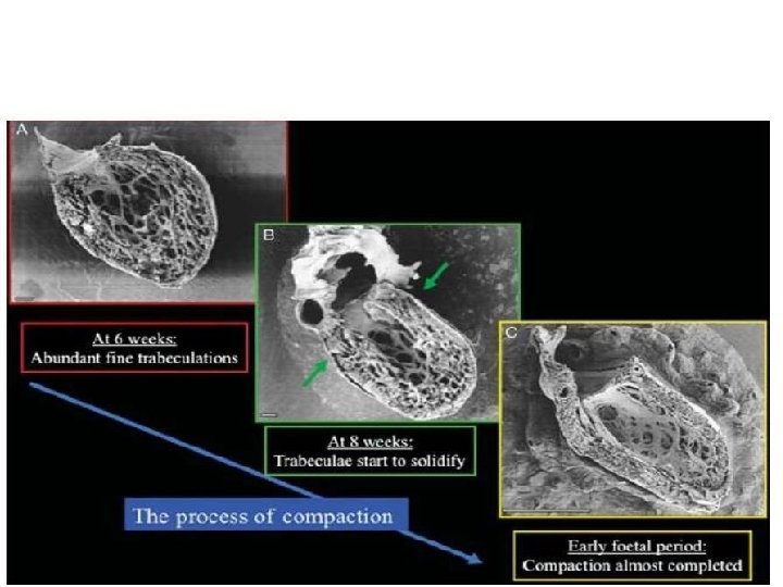 Trabecular remodeling • After completion of ventricular septation at 8 weeks of gestation in • Increase in ventricular volumes results in compression of the trabeculations with an increase in the thickness of the compacted myocardium • Compaction process coincides with the invasion of epicardial coronary arteries