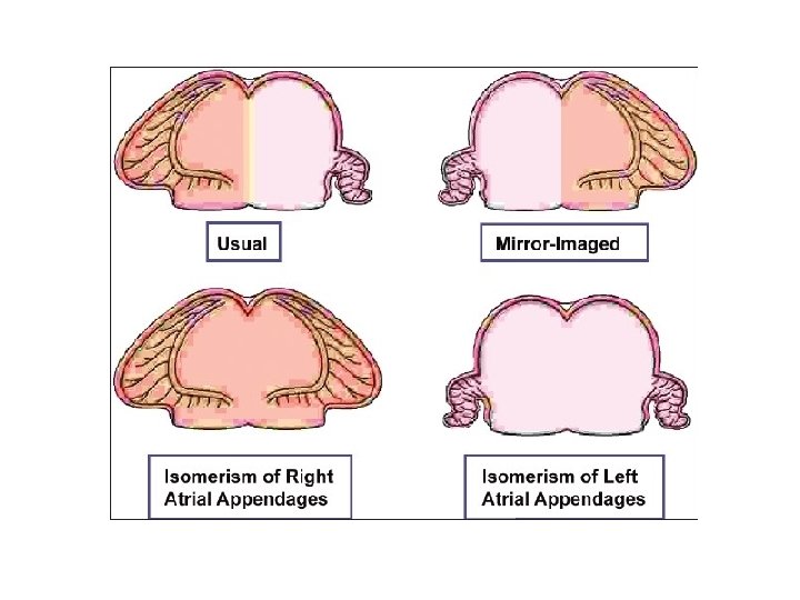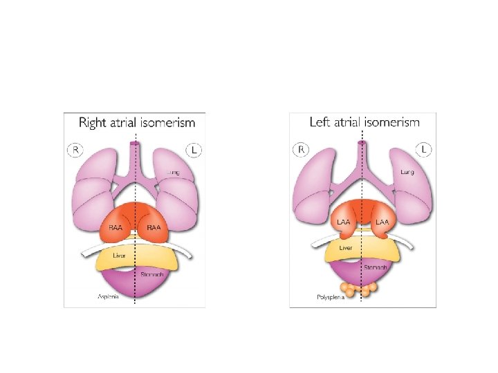 Right Isomerism • Cardiac : – The sinus nodes are paired because bilateral superior vena cavae are attached to bilateral morphologic right atria. – The P-wave axis is normal because the right sinus node is usually the dominant atrial pacemaker – The atrioventricular conduction system is equipped with 2 nodes often connected by a sling of tissue – Supraventricular tachycardia is attributed to reentry between paired atrioventricular nodes.