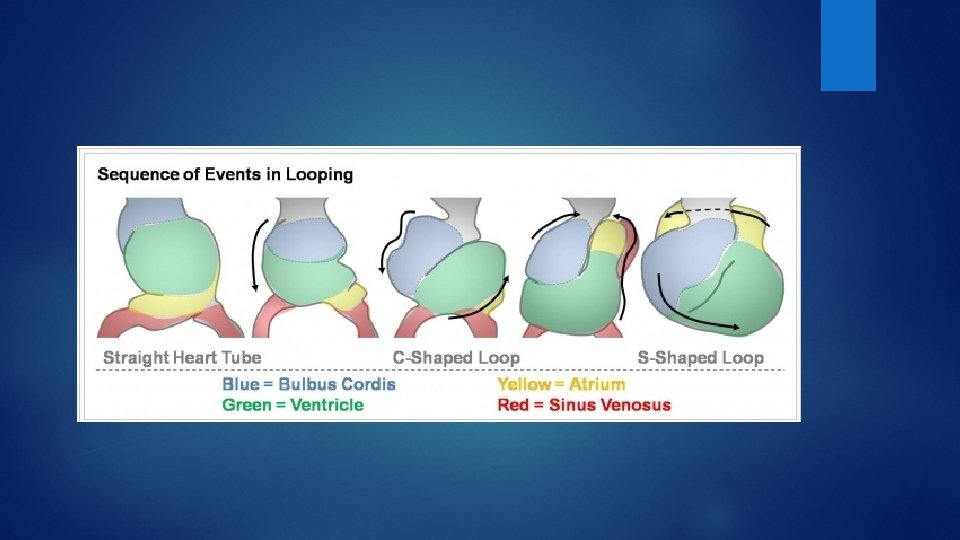 Looping of heart D-loop: Rightward (“dextro”) bend. L-loop: Leftward (“levo”) bend Cardiac looping in late fourth week and early fifth week