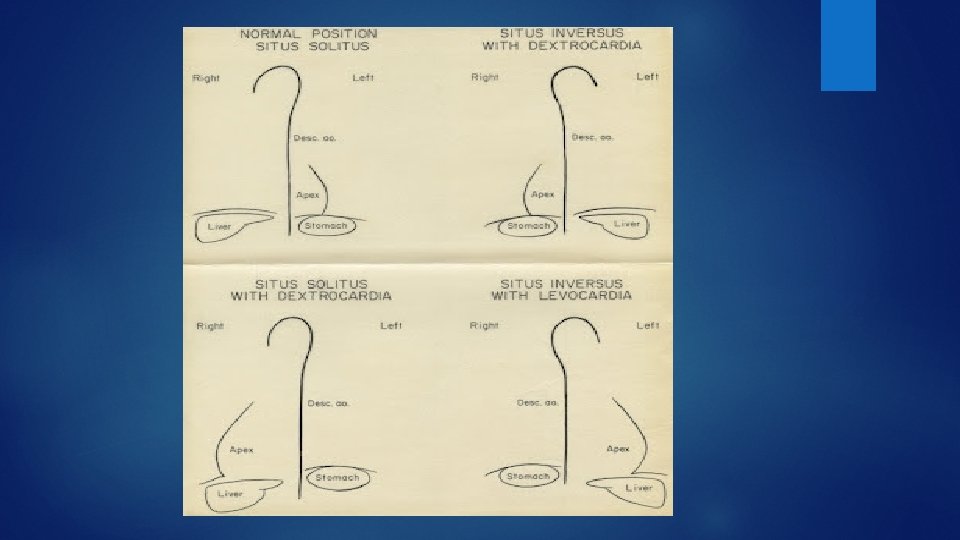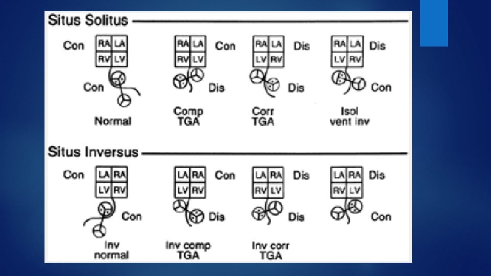 Situs inversus: Mirror image / inversion or right/left reversal of visceral or atrial site or position Situs ambiguous : uncertain or indeterminate visceral or atrial position because of symmetric or indeterminate anatomy bilaterally