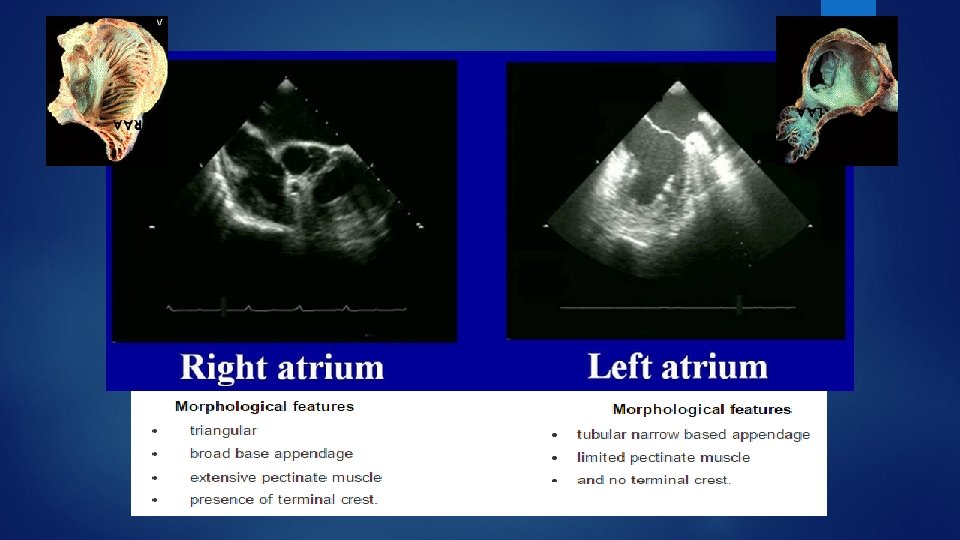 The relationship between septum primum and septum secundum is the most reliable determinant of atrial situs Morphologic right atrium The inferior rim of septum secundum Best seen by echocardiography as the superior limbus of the fossa ovalis Morphologic left atrium The remnant of septum primum best seen by echocardiography as the valve of the fossa ovalis.