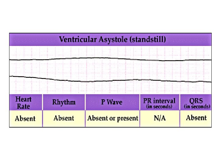 Asystole Regularity: Rate: P Waves: PRI: QRS: Straight line indicates absence of electrical activity Bad JUJU, Dude