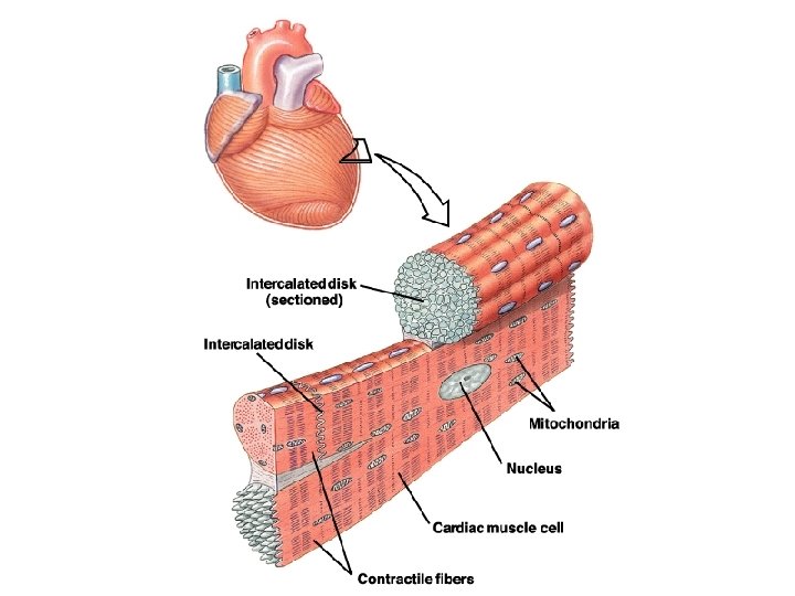 Most myocardial cells • • Remaining myocardial cells are striated Have sarcomeres Much smaller than skeletal muscle fibers Connected by gap junctions at intercalated discs • Lots of mitochondria • Lots of blood flow to myocardial cells