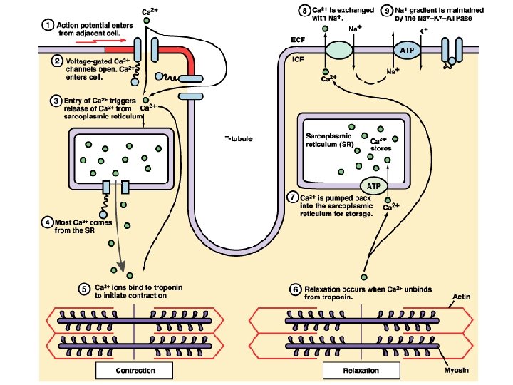 Excitation-contraction coupling • Depolarization cell membrane voltage gated Ca++ channels open • Ca++ enters cell • calcium-induced calcium release: Ca++ released from SR • Ca++ binds to troponin contraction