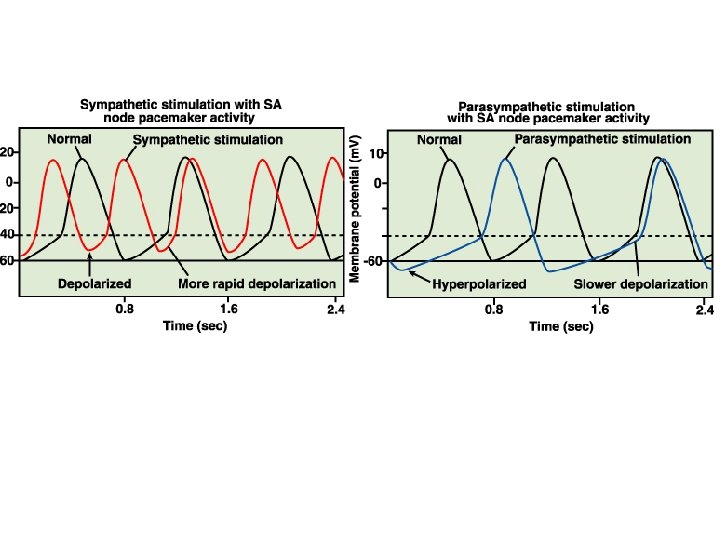 Modulation of autorhythmic cells • Parasympathetic, acetyl choline • Muscarinic receptors • K+ channels open mb hyperpolarizes cell less excitable • Ca++ channel less likely to open slower depolarization cell is less excitable