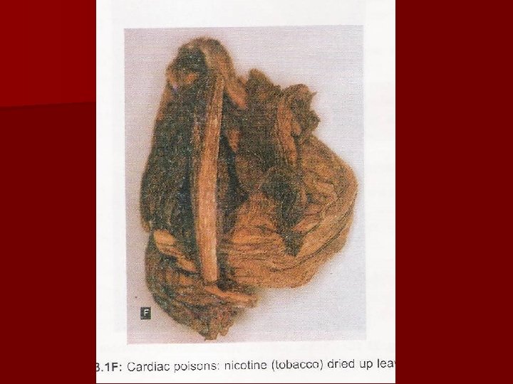 Postmortem Appearance n Not characteristic n Irritation of gastric mucosa. n Digitalis leaves or seeds may be found in stomach. The seeds are reddish brown, remarkably small & some what angular in shape with peculiar markings.