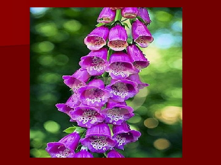 Digitalis Purpurea (Fox Glove) n 1. 2. 3. 4. This is a poisonous plant. Its roots , leaves & seeds contain several glycosides of which Digitoxin Digitalein Digitonin.