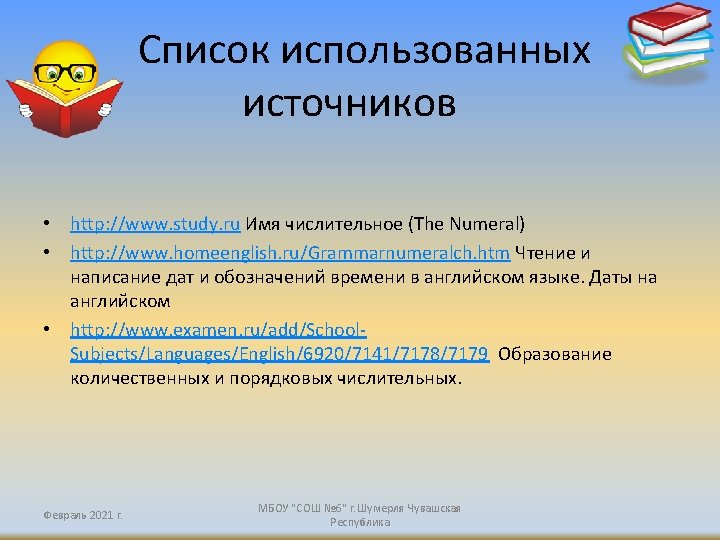 Чтение обозначения года 1754 - the year seventeen hundred and fifty-four. 2000 год — the year two thousand 2007 — two thousand (and) seven 2014 - twenty fourteen 2020 - twenty Февраль 2021 г. МБОУ "СОШ № 6" г. Шумерля Чувашская Республика