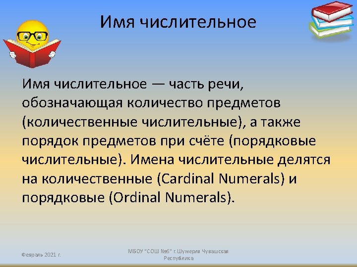 Количественные числительные (Cardinal Numerals) how many? 1 - one 2 - two 3 - three 4 - four 5 - five 6 - six 7 - seven 8 - eight 9 - nine 10 – ten 11 - eleven 12 - twelve 13 - thirteen 14 - fourteen 15 – fifteen Февраль 2021 г. 16 - sixteen 17 - seventeen 18 - eighteen 19 - nineteen 20 – twenty 21 - twenty-one 22 - twenty-two 23 - twenty-three 24 - twenty-four 25 - twenty-five 26 - twenty-six 27 - twenty-seven 28 - twenty-eight 29 - twenty-nine 30 – thirty МБОУ "СОШ № 6" г. Шумерля Чувашская Республика 40 - forty 50 - fifty 60 - sixty 70 - seventy 80 - eighty 90 - ninety 100 - one hundred 7, 000 5, 550, 000