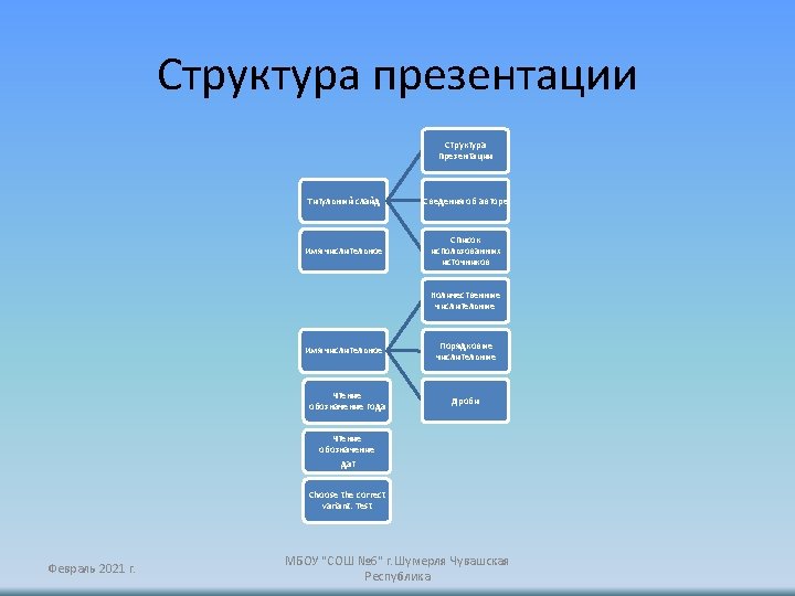 Choose the correct variant. Test Ø Укажите порядковые числительные o four o zero o ten o eighteen o twelfth Ø Укажите количественные числительные o twenty-one o a hundred o sixtieth o two millionth o fourty-nine Ø Выберите верную запись числа 2000 o two hundreds o two hundred o twos hundreds Февраль 2021 г. Ø Выберите верную запись порядкового числительного 22 nd o twentys-second o twentieth-second o twenty-seconds Ø Выберите верную запись года 1954 o one thousand nine hundred and fifty-four o nineteen and fifty-four o one thousand nine hundred and fifty-four Ø Выберите возможные варианту записи даты: April, 14 o April, fourteen o The fourteenth of April o April the fourteenth o Fourteen of April МБОУ "СОШ № 6" г. Шумерля Чувашская Республика