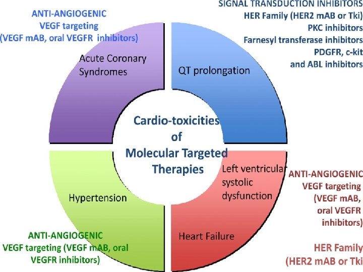 Angiogenesis Inhibitors: HTN � Drugs: Sorafenib (VEGFR, PDGFR and Raf family kinases), Bevacizumab (VEGFR), Sunitinib (VEGFR, PDGFR) ◦ Metastatic renal cell cancer, ovarian cancer, metastatic colorectal cancer Prevalence: 15 -60% develop HTN (link between HTN and improved progression free survival) � Risk Factors: Hx of HTN, >1 combo therapy, >65 yo, smoking, HL � Treatment: Ace-Inhibitors and/or dihydropyridine calcium channel blockers; avoid inhibitors of CYP 3 A 4 (diltiazem, verapamil) as TKIs are substrates, could consider nevibolol (Bystolic) (beta-blocker which increases NO bioavailability); Franciscan grant written to test this � ◦ May need to decrease dose or halt therapy until HTN controlled; HTN resolves once agent stopped