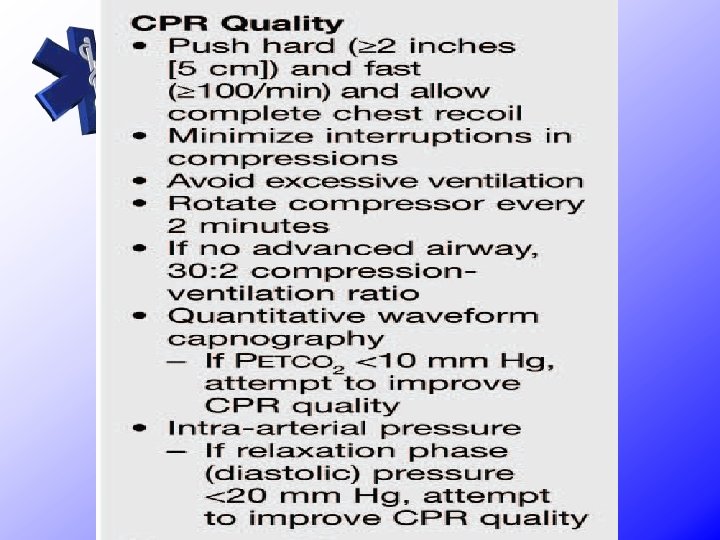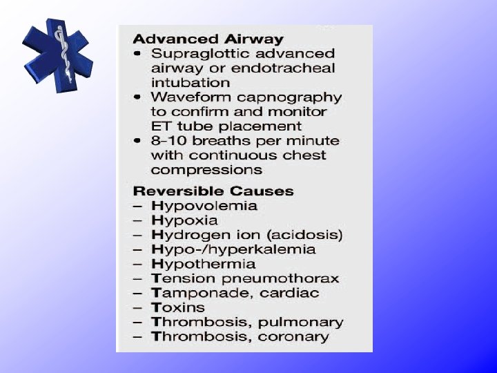 • • IV Access Airway management Medication and defibrilation Post CPR