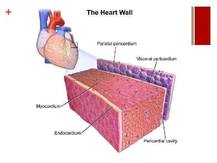 + ANATOMY OF THE HEART n Heart consists of three layers: 1. Pericardium- outer double layer bag or membrane containing fluid. Functions to reduce friction and maintain heart shape 2. Myocardium (Cardiac Muscle)- contracts the same way as skeletal muscle. Receives stimulus from the CNS to the hearts pacemaker. Works in a all or none principle) 3. Endocardium- smooth inner membrane. Functions to prevent friction between heart muscle and blood