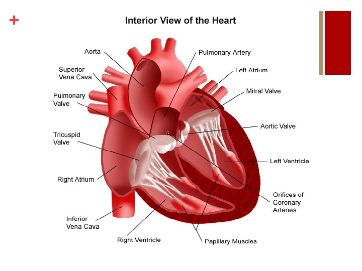 + ANATOMY OF THE HEART: Veins and Arteries n Vena Cavae (Superior and Inferior) – deliver deoxygenated blood from the body into the right atrium n Pulmonary Arteries- deliver de-oxygenated blood from the right ventricle to the lungs n Pulmonary Veins – deliver oxygenated blood from the lungs into the left atrium n Aorta – delivers oxygenated blood from the left ventricle to the body