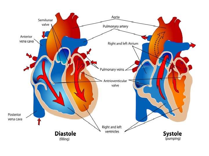 + CARDIAC CYCLE n Defined as the order of events that make up one heart beat. n Cycle lasts for ~0. 8 seconds and occurs ~72 times a minutes n Consists of a period of relaxation, known as diastole (0. 5 sec), followed by a period of contraction, known as systole (0. 3 seconds)