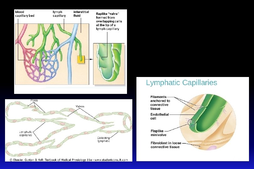 q Theses are blind sacs that collect excess tissue fluid. q They consist of simple squamous epithelium (endothelium). q Cells overlap to form oneway valves within lumen. q The gaps between the endothelial cells are very large. They lack tight junctions. q They possess fine filaments which anchor them to the connective tissue q With contractions, these filaments can pull on the endothelial cells, and thus allowing protein, large particles or cells to enter lymph system. Lymphatic vessels: lymphatic capillaries
