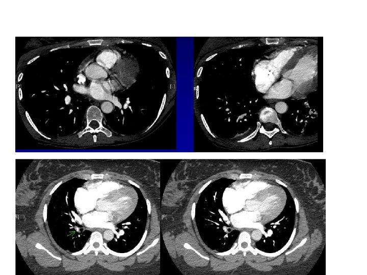 CTA (Coronal Reconstruction) Embolus in descending right pulmonary artery Embolus in left main pulmonary artery NORMAL HOMOGENOUS FILLING OF THE VESSLES