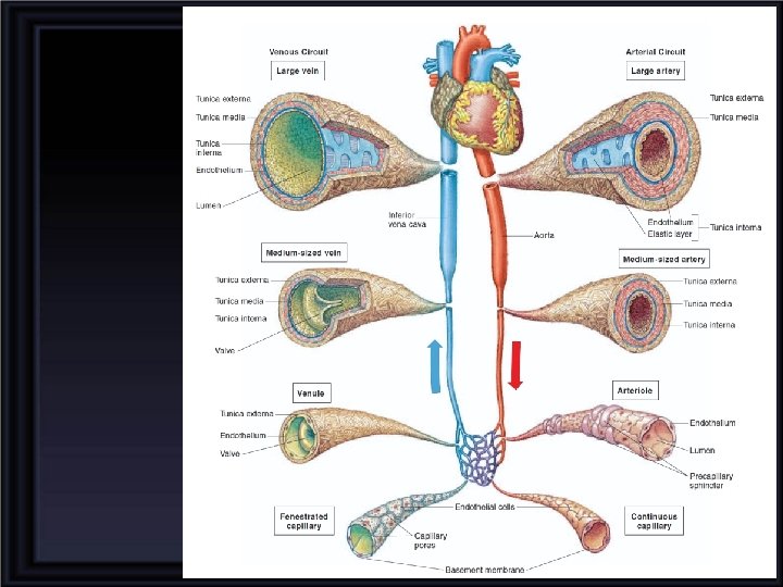 Types of Capillaries Continuous: muscles, lungs, adipose tissue, and central nervous system Fenestrated: kidneys, endocrine glands and intestines Discontinuous: bone marrow, liver, and spleen