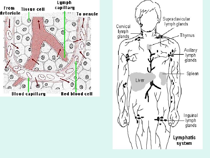 Lymphatic Circulation: open vessels that collect excess tissue fluid. There are probably as many lymph vessels as there are blood vessels. Lymphatic capillaries: are located in the blood capillary beds and collect excess fluid that is forced out of the arterial ends of the blood capillaries. Lymph nodes: small bean-shaped enlargements found along the length of lymph vessels that act as filters and producers of special white blood cells that prevent harmful material from invading the body cells.
