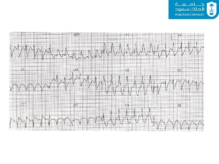 Ventricular Fibrillation • The most serious of all arrhythmias • Cause: impulses stimulate one part of the ventricles, then another, then itself. Many part contracts at the same time while other parts relax (Circus movement) – – Tachycardia Irregular rhythm Broad QRS complex No P wave • Treatment : DC shock