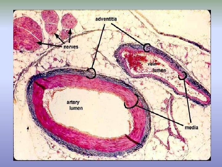 General structure of the blood vessels 1. Tunica intima: the innermost layer. It consists of: a) Endothelium, s. sq. epithelium rests on a basal lamina. b) Subendothelial layer of loose connective tissue. c) Internal elastic lamina, a layer of elastic f. (in arteries only). 2. Tunica media: (middle layer), the main bulk of the artery. It consists of : smooth muscle fibers, elastic, reticular and some collagen fibers. ± In large arteries thin external elastic lamina separating the media from the adventitia. 3. Tunica adventitia: it is the outermost layer. It consists of loose connective tissue rich in collagen fibers. Tiny blood vessels (vasa vasorum), lymphatic vessels and nerve fibers (vasa nervosa) are present in this layer. It merges with the surrounding connective tissue.