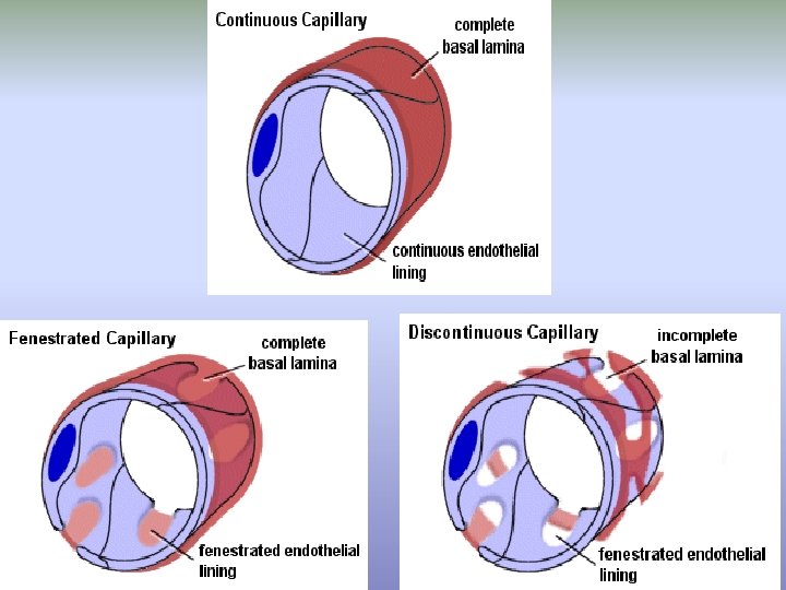 1. Continuous capillaries: - They are the usual type found in most tissues. - Their endothelial cells are continuous and separated from each other by a thin space of 200 A°. - In the brain the blood capillaries have the following characters: • The endothelial cells are joined by zonula occludens. • Thick basement membrane. • The capillaries are surrounded by the processes of the pericytes. 2. Fenestrated capillaries: - The endothelial cells have rounded circular pores or fenestrae, which covered by thin diaphragm (capillaries in kidney glomeruli lacks these diaphragms, hence represent true openings). - The edges of the endothelial cells have wide gaps of 800 A°. - This type of capillaries is found in some tissues where there is much molecular exchange with the blood as in the small intestine, endocrine glands and kidney. Fenestrations permit the rapid passage of macromolecules smaller than plasma proteins.
