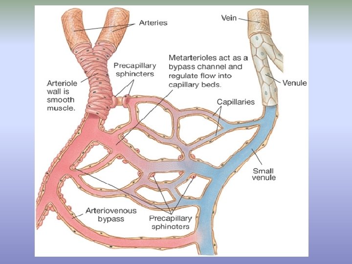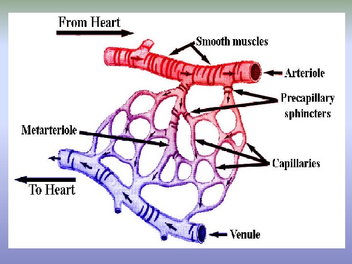 The microcirculation including arterioles, capillaries and venules. The capillaries lie between, or connect, the arterioles and venules. Capillaries form extensive branching networks that dramatically increase the surface areas available for the rapid exchange of molecules. • A metarteriole is a vessel that emerges from an arteriole and supplies a group of 10 to 100 capillaries. Both the arteriole and the proximal portion of the metarterioles are surrounded by smooth muscle fibers whose contractions and relaxations regulate blood flow through the capillary bed. Typically, blood flows intermittently through a capillary bed due to the periodic contractions of the smooth muscles (5 -10 times per minute, vasomotion), which is regulated both locally (metabolically) and by sympathetic control.