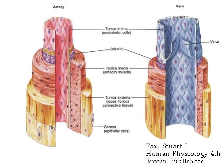 Veins Venous system returns blood from the capillary networks to the heart. They start at the capillary bed as 1. Post-capillary venules 2. venules 3. medium-sized veins 4. large veins. Compared with the arteries the veins have wide collapsed lumen, thin wall and full of blood. Structure: similar to those of the arteries, but the elastic and muscular components are less prominent. Venules: • The intima is composed of endothelium rest on a thin layer of connective tissue, which may be absent. • The media consists of few cells of smooth muscle • with thin layer of loose connective tissue.