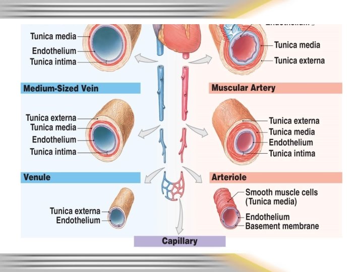 Structure of vessel walls • Three layers – Tunica intima or innermost layer. Includes a lining of endothelium and a connective tissue layer. – Tunica media or middle layer. Contains smooth muscle tissue and collagen and elastic fibers. – Tunica externa forms sheath of connective tissue around the vessel.