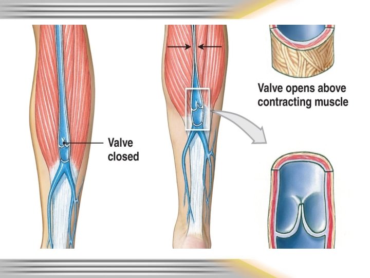 Veins collect blood and return it to the heart • Venules: smallest • Veins have relatively thin walls. • In medium veins contain valves that prevent the backflow of blood due to low pressure and gravity • Stretching and distortion of these valves cause varicose veins.