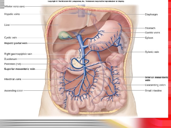 Hepatic Portal System • A venous network that drains the GI tract and shunts the blood to the liver for processing and absorption of transported materials. • Blood exits the liver through hepatic veins that merge with the inferior vena cava. • Is needed because the GI tract absorbs digested nutrients, and these nutrients must be processed and/or stored in the liver.