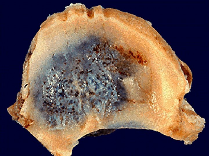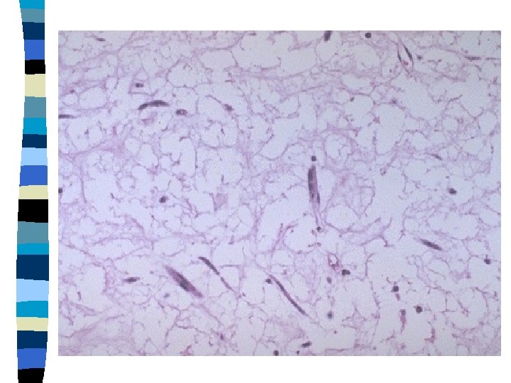 • Histologic Findings: • In general, myxomas are globular, hard, and mottled lesions with hemorrhage. • Histologically, they are composed of stellate or globular myxoma cells, endothelial cells, macrophages, mature or immature smooth muscle cells, and a variety of intermediate forms embedded in an abundant acid mucopolysaccharide ground substance.