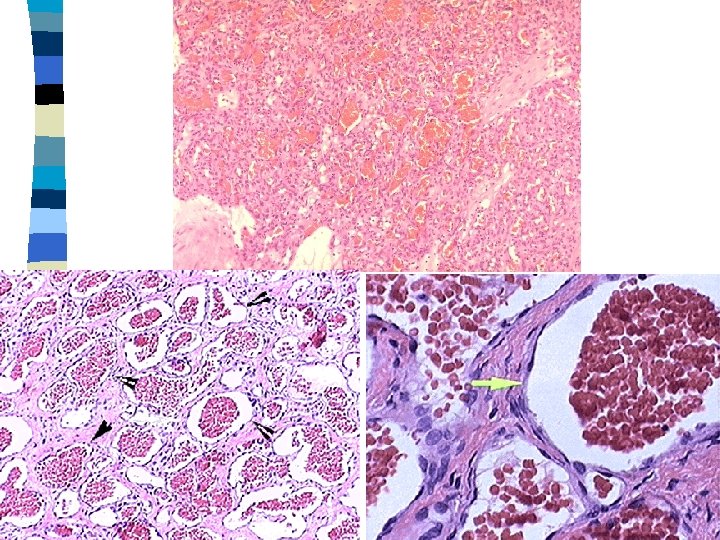 Hemangiomas • • • Mostly hamartomas. The endothelial cells are of course clonal and show some enhanced responses to some growth factors. Capillary hemangiomas (little vessels) and cavernous hemangiomas (big vessels) are common on the skin. Stork bites (leylek izi) backs of the neck and/or forehead of a baby) usually involute (i. e. , thrombose and organize) after a few years, while cherry angiomas of the skin start popping up after age 20 or so. Port-wine stain (one form of "nevus flammeus"), fashionable in the Gorbachev era, can be treated by laser. Sturge-Weber syndrome: a hemangioma in the meninges, generally with an overlying port-wine stain in the check the eyelids.