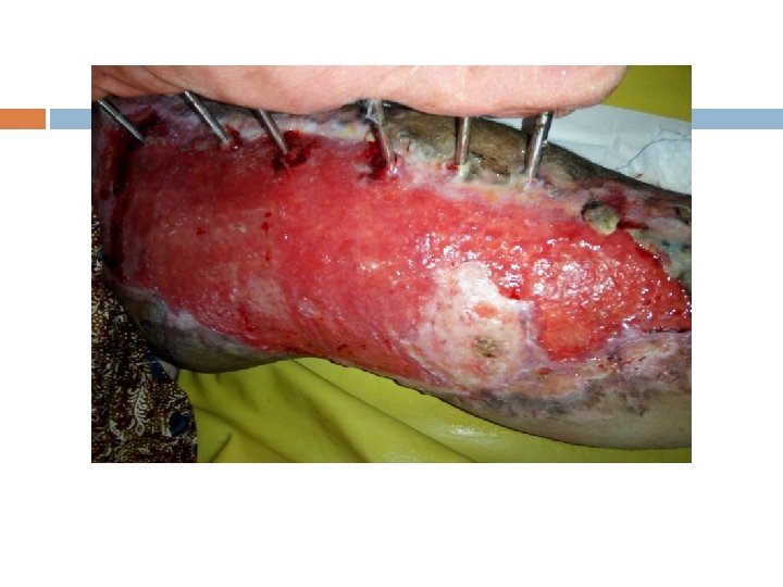 Perawatan Luka fasiotomi Luka jangan ditutup setelah tindakan fasiotomi “Second look “ debridement dengan pertimbangan untuk dilakukan penutupan setelah 48 -72 jam � Resiko untuk terjadinya pembengkakan limb (-) � Stabilisasi sudah adekuat � Skin graft � Penutupan luka secara langsung dimungkinkan bila pembengkakan sudah hilang Goal : penutupan secara definitive dalam 7 -10 hari � FTSG/STSG/flap jika saraf, pembuluh darah, dan tulang terexpose. � Prinsip perawatan mempertahankan moist dan cegah