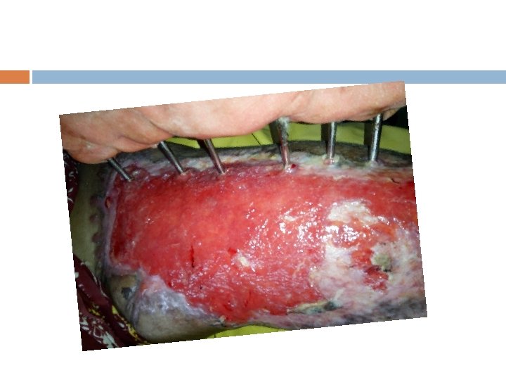 The Irritated Pin Site q q Tampak kemerahan, ada rasa nyeri / tenderness disekitar wire /pin. Dimungkinkan ada cairan warna jerni dari pin-site. Timbul pada 2 minggu pertama post EF. Hal ini terjadi karena adanya gesekan dan tarikan pada kulit sekitar wire/pin, dimungkinkan juga tubuh masih adaptasi.