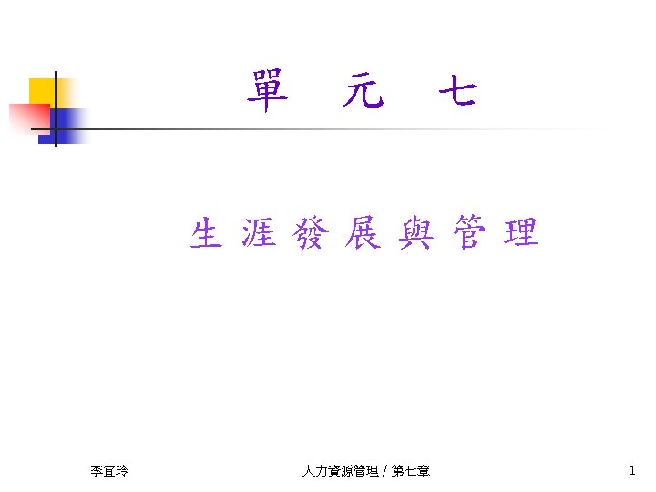 Career-Impacted Life Stage n 成長期(Growth stage) : <14 n n 試驗期(25~30) 穩定期(30~40) 中年危機期(40~44) 維持期(maintenance stage) : 45~65 n n 了解自我興趣與能力 建立期(establishment stage) : 25~44 n n 建立自我概念 探索期(exploration and trail stage): 15~24 n n Super 維持職涯成就 解離期(disengagement stage): >65 n 身體 李宜玲 心理 權力 責任 人力資源管理 / 第七章 16