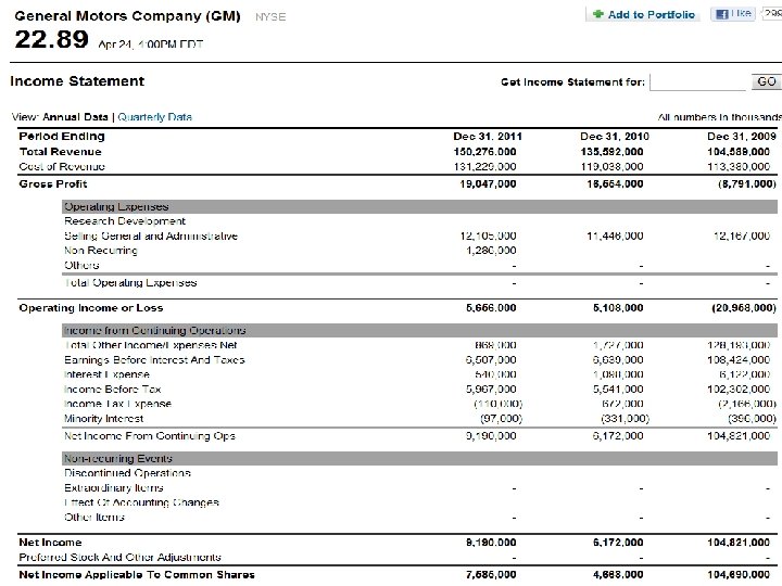 Profit General Motors • Sales – Money made selling cars • Expenses – Buy parts to put the car together – Buy TV ads – Pay Employees
