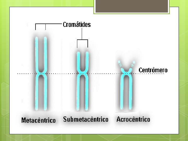 Característica Morfologicamente, os cromossomos são identificados, diferenciados e classificados quanto ao tamanho e localização do centrômero (região do cromossomo intermediária aos braços simétricos ou assimétricos, curtos ou longos).