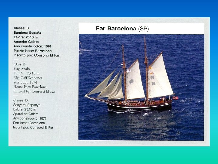 Jordi Valls Pere Alcober Andor Serra Presidente Port de Barcelona Delegado del Alcalde para Deportes Director General Consorci El Far Vivimos en un tiempo en que el transporte marítimo y todos los aspectos relacionados con la navegación están experimentando cambios radicales, y el Port de Barcelona es un excelente exponente en pocos años se ha duplicado el arqueo medio de los buques, están llegando barcos con capacidad para 8. 000 contenedores –pronto llegarán los de 12. 000 - y los grandes cruceros con más de 4. 000 pasajeros tienen Barcelona como puerto de la Mediterránea. La Sail Training International es una organización que promueve el aprendizaje de la vela tradicional como deporte y como vehículo de transmisión de valores. Por ejemplo, en sus regatas pone como condición que el 50% de la tripulación de los barcos tengan menos de 25 años. También se preocupa de fomentar la comunicación entre las diversas nacionalidades que participan en una regata de estas características, a través de actividades conjuntas entre tripulaciones. Esta publicación, de formato cómodo y con un contenido que contiene de manera integral la oferta náutica de Barcelona, nace con la vocación de ser un nexo entre nuestra ciudad y el mar. Barcelona y el mar han vivido siempre juntos