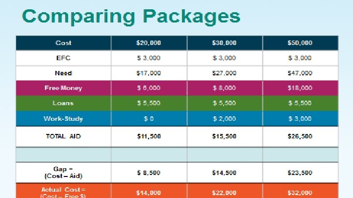Reviewing the Financial Aid Package • After reviewing their packages, students should be sure they know and understand the following: » How much of the financial aid is free money? » Which awards are based on need, and which are based on merit? » Are there any conditions on the free money; in particular, is there a GPA requirement? » Will awards change from year to year? » Will institutional awards increase as tuition increases? » Will loans be needed? If so, how much?