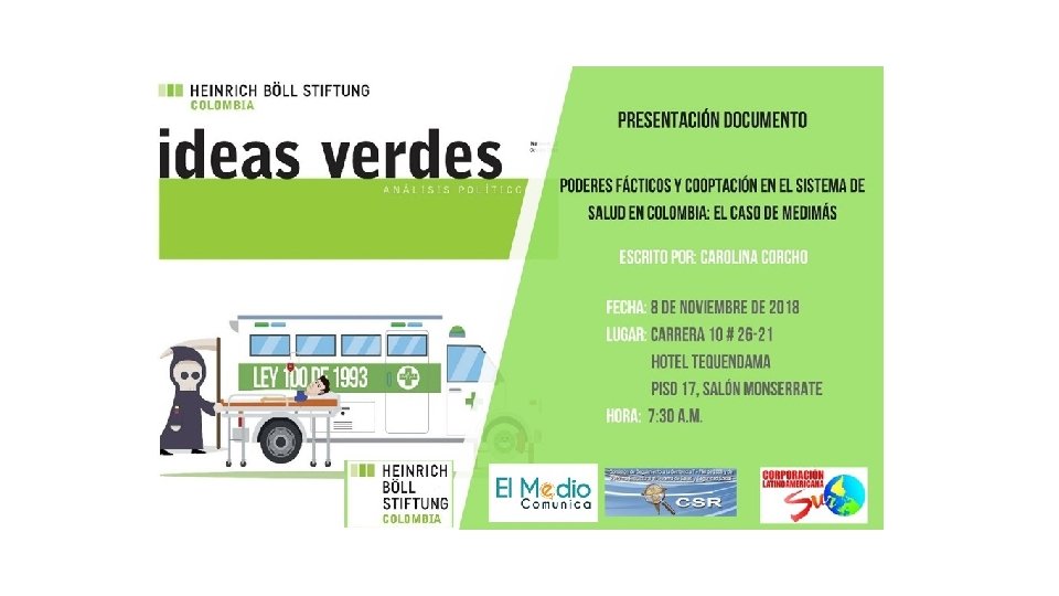 ALGUNAS PREMISAS • La captura del estado es una forma de corrupción administrativa. • En el sistema de salud existen poderes fácticos, es decir, actores capaces de movilizar recursos políticos para incidir en la política pública y obtener beneficios para sí. • El caso de Medimás no constituye una manzana podrida del sistema de salud, es en sí mismo la forma como ha funcionado y se ha concebido la salud en Colombia desde los poderes hegemónicos.