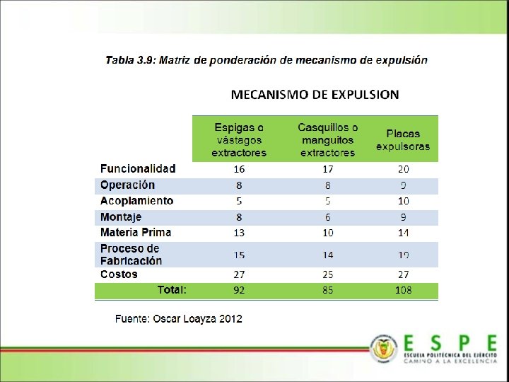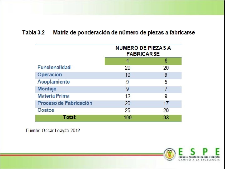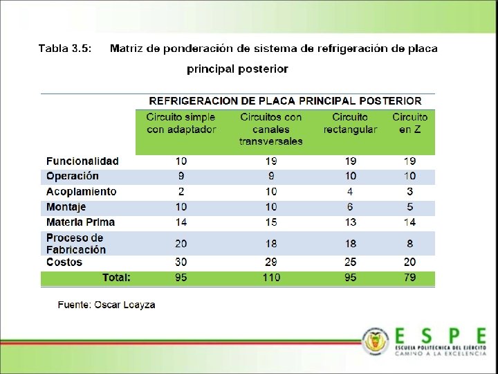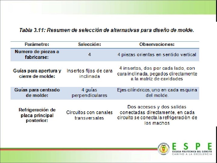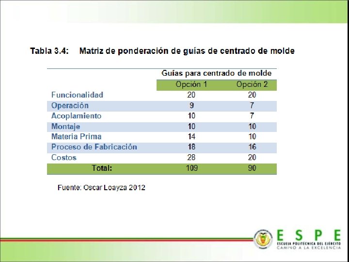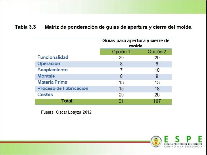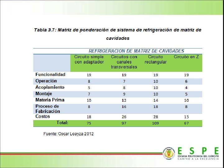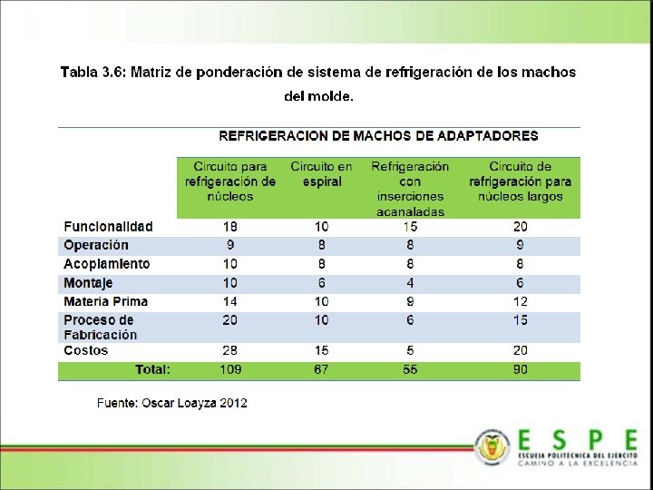 CAPÍTULO 3 ANALISIS Y SELECCIÓN DE ALTERNATIVAS Tomando en cuenta todos los factores técnicos como los económicos, en cada uno de los elementos a analizarse previo a la construcción del molde, podemos elaborar un método de toma de decisiones, (método subjetivo). El primer paso para poder utilizar este método, será asignar un valor a cada factor a considerarse, tal como lo muestra el siguiente cuadro: