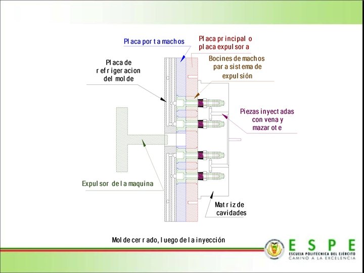 Ensamblaje de placas posteriores, bocines, machos y matriz de cavidades