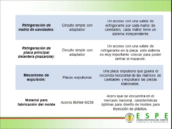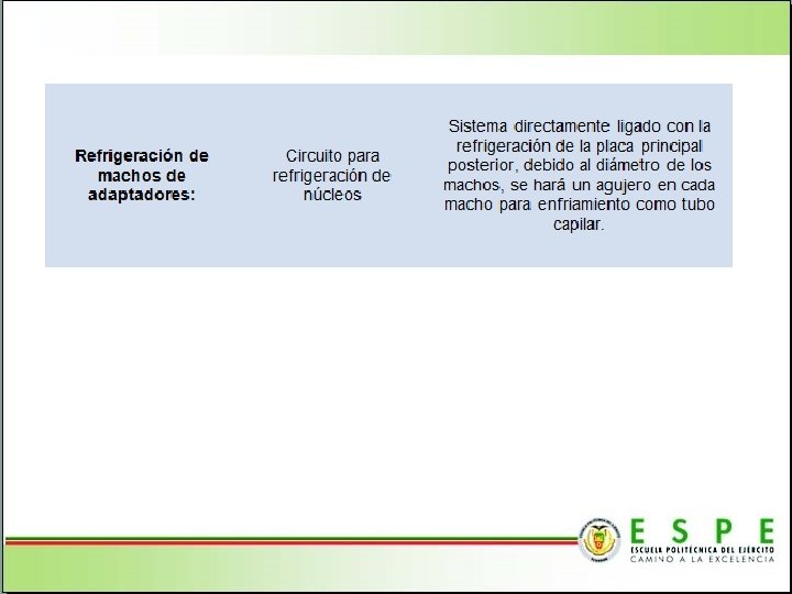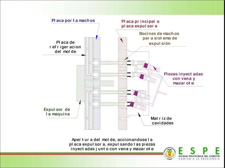 RESUMEN En este proyecto se diseñó y construyó un molde de inyección de plástico, para la fabricación de adaptadores de 1/2" NPT, con una producción de cuatro unidades por inyección, el principal motivo asociado para la ejecución la venta de este producto por parte de la empresa auspiciante, por esta razón la empresa necesita incrementar el nivel de producción además de la calidad de sus productos para mejorar sus ingresos, por esta razón se plantea satisfacer esta necesidad expuesta. Para la fabricación de los adaptadores, la empresa cuenta con maquinas inyectoras manuales y semiautomáticas, las mismas que se utilizan como base para el diseño del molde ya que trabajará en estas máquinas. El molde posee un diseño versátil, que agilita la producción de los adaptadores con una eficiencia buscada por la empresa auspiciante, eliminando prácticas de refrigeración del molde y extracción o desmoldeo de piezas fabricadas de forma manual, automatizando el proceso con sistemas mecánicos que permiten a la empresa aumentar su nivel de producción y eliminar el porcentaje de pérdida por fabricación de adaptadores deformes. EL molde posee un sistema automático de apertura y cierre además de un sistema automático de expulsión, que son muy prácticos y funcionales, permiten la producción en serie y minimizan desperdicios o desperfectos en los adaptadores elaborados, son fáciles de ensamblar y sencillos para acoplar con otros moldes. El molde fue fabricado en la empresa PRODUCTOS FORTIFLEX, y se contrató servicios especializados externos para los procesos de maquinado y electro-erosionado de los elementos del molde, servicios que no se podían realizar en la empresa. En la última etapa del proyecto se realizaron las pruebas del molde y las correcciones necesarias además de las calibraciones en la maquina para el correcto funcionamiento de nuestro molde, el mismo que fue aceptado por la empresa auspiciante ya que cumple con las especificaciones solicitadas y satisfizo las expectativas esperadas.