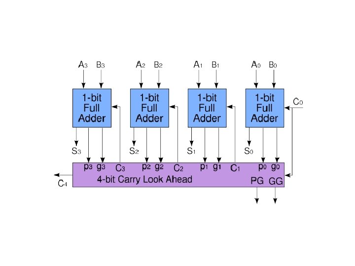 • • • • • • architecture Behavioral of carrylookadder is signal c: std_logic_vector(4 downto 0); signal p, g: std_logic_vector(3 downto 0); begin G 1: for i in 3 downto 0 generate p(i) <= a(i) xor b(i); -- p is a sum of half adder g(i) <= a(i) and b(i); -- g is a carry of a half adder s(i) <= p(i) xor c(i); -- s is a sum of the full adder end generate; -------Carry look ahead array c(0) <= cin; c(1) <= (cin and p(0)) or g(0); -- c(1)<= c(0)and p(0) or g(0) c(2) <= (cin and p(0) and p(1)) or (g(0) and p(1)) or g(1); -- c(2)<= c(1)and p(1) or g(1); c(3) <= (cin and p(0) and p(1) and p(2)) or (g(1) and p(2)) or g(2); --c(3)<=c(2)and p(2) or g(2) c(4) <= (cin and p(0) and p(1) and p(2) and p(3)) or (g(1) and p(2) and p(3)) or (g(2) and p(3)) or g(3); -- c(3) <= (c(2)and p(2)) or g(2) cout <= c(4); -- c(4) <= (c(3) and p(3)) or g(3) end Behavioral;