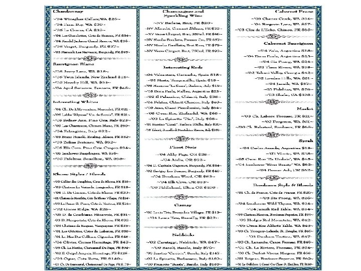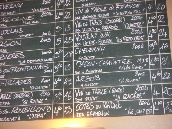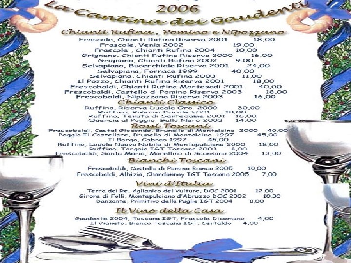 APRESENTAÇÃO DOS VINHOS (NOMENCLATURA) § NOVO MUNDO (VINHOS VARIETAIS) UVA / PREDICADO / PRODUTOR / SAFRA (REGIÃO / PAÍS - FACULTATIVAS) CHARDONNAY / RESERVA / MIOLO / / 2002 (VALE DOS VINHEDOS / BRASIL). SAUVIGNON BLANC / SANTA HELENA SELECION DEL DIRETÓRIO / VINOS DEL CHILE / 2001 § VELHO MUNDO (VINHOS REGIONAIS) REGIÃO / CLASSIFICAÇÃO / PREDICADO / PRODUTOR / SAFRA. CHIANTI CLÁSSICO / D. O. C. G. / RISERVA / ROCCA DE LA MACIE / 1997 CH TEAU HAUT-BRION / 1985 PORTO TAWNI REAL COMPANHIA VELHA