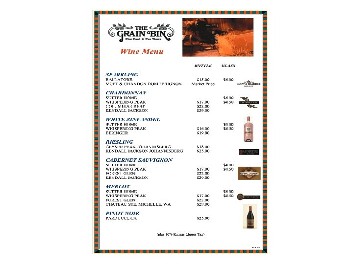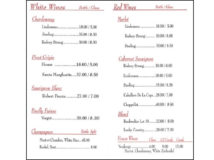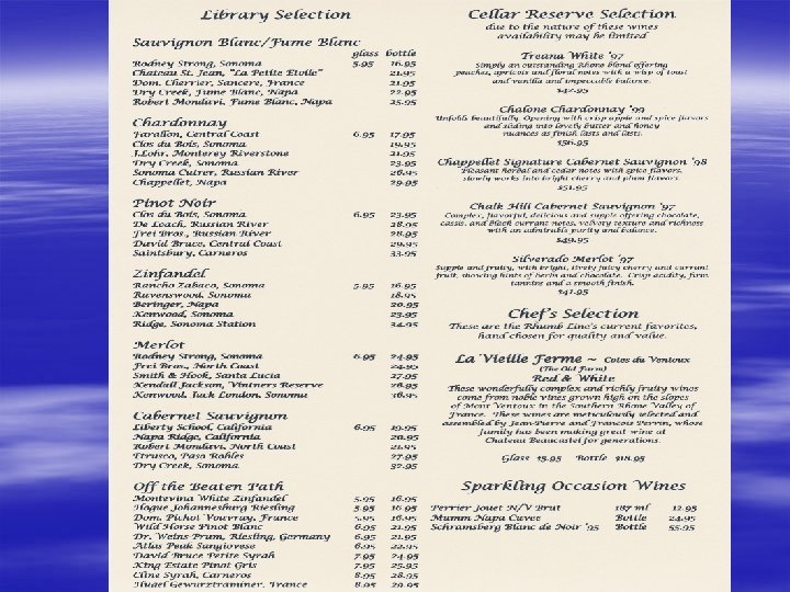 ANÁLISE DE CUSTO § CUSTO DO CARDÁPIO (COUVERT MÉDIO) 40% VINHOS - PREÇO ABAIXO DO COUVERT MÉDIO 50% VINHOS - PREÇO PRÓXIMO AO COUVERT MÉDIO 10% VINHOS - PREÇO ACIMA DO COUVERT MÉDIO § CUSTO DA BEBIDA PREÇO FINAL – 60 A 80 % DO PREÇO DE CUSTO (OS VINHOS MAIS BARATOS A MARGEM É MAIOR E VICE-VERSA)